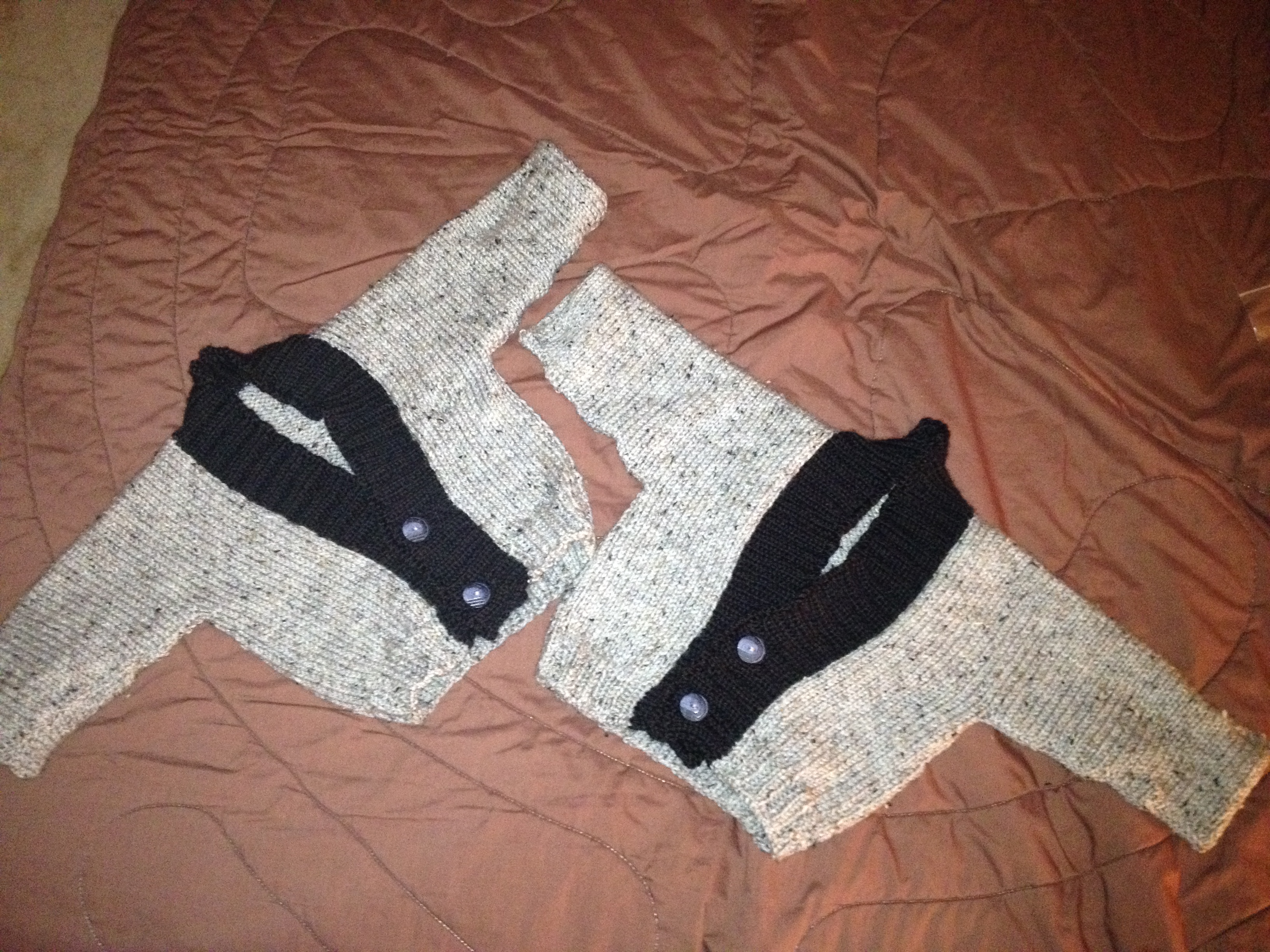 They may have started off as part of an entire set. There were hats, booties, even bibs that were brainstormed. These Ravelry searches and late-night swatch sessions left me pushing the deadline to complete the sweaters alone. But I finally cast on and finished most of the first sweater. Right before a little munchkin stole my pattern with all the notes necessary to complete the rest of the sweater and to make its twin! Silly, M.