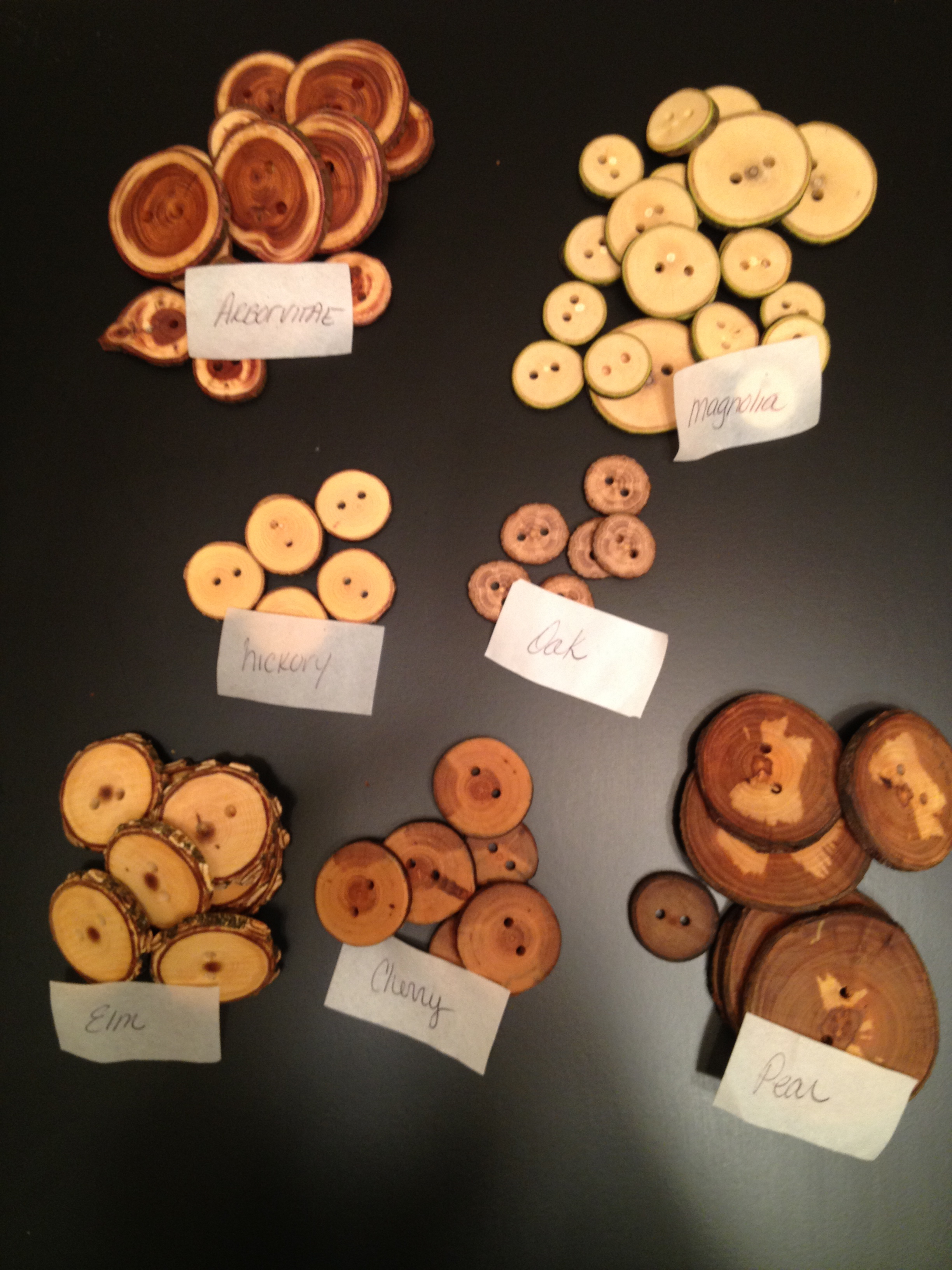 The wood types I received were sumac, magnolia, arborvitae, hickory, cherry, oak, pear and elm. Each wood type was in its own little ziplock bag with a label so that non-wood-aficionados such as myself can forever keep them straight. Each button has character. You can tell time was spent making each individual button something special. Both sides are sanded smooth and though, the edges maintain their natural textures, they are beveled to provide smooth functionality and provide a well-finished appearance.