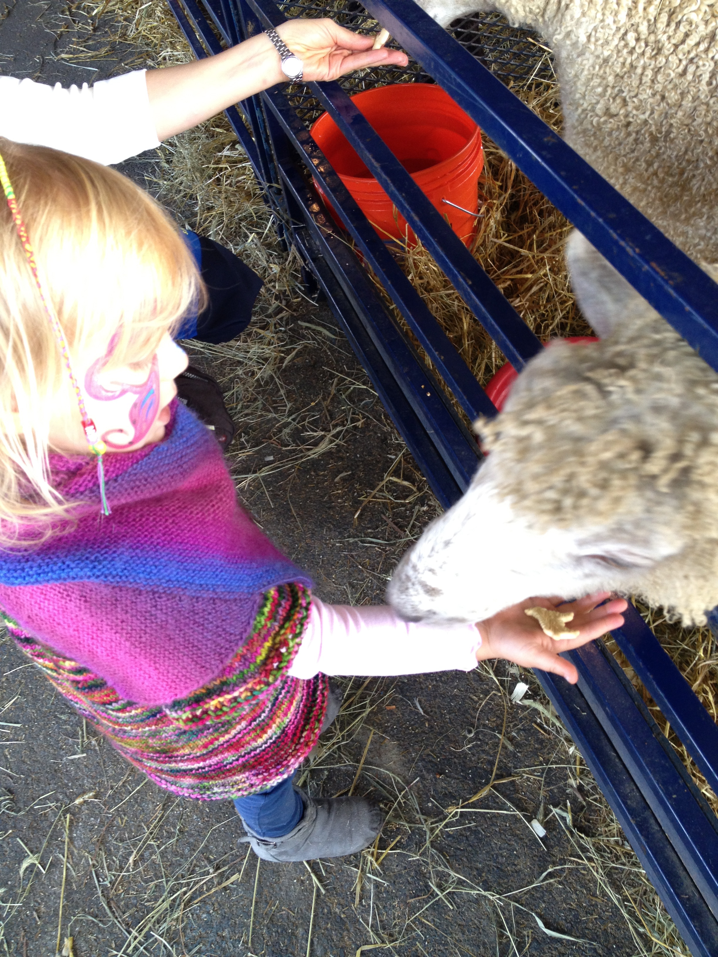 Last year, I purchased my first fleece, and M was there to help sort and wash it with me. She also helped pick out my only purchases at the NY Sheep and Wool Festival (aka Rhinebeck) and guided (or dragged) me around the barns to visit with every sheep at least three times before we left. She has a definite interest and still likes to treadle at the wheel, but I think her interests fall much more toward the fiber and spinning side of the spectrum and she has no interest in knitting or crocheting at this point. I believe her words were: “But Mommy, you can just make it for me”.