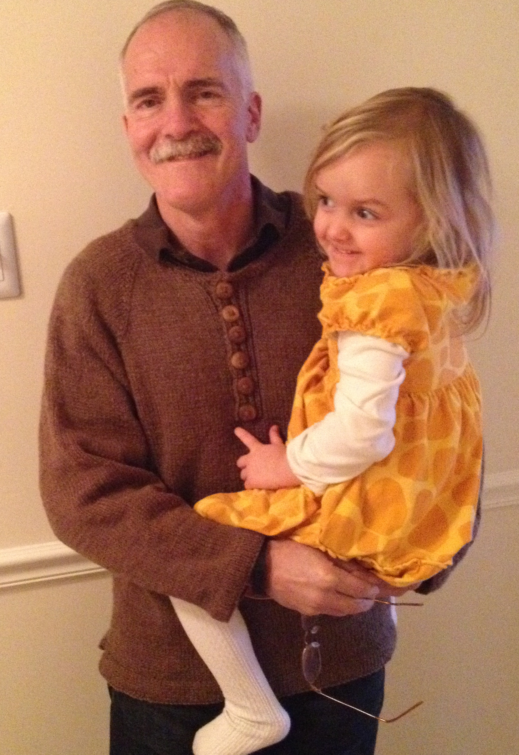 On Presidents’ Day, I took advantage of my day off to not only clean my place, but to sew the rest of the fold-over hems on my father’s sweater as well as sew on the six buttons. One would maybe think this should have been done back in September when the knitting was finished. But after finishing the hems at the bottom of the sweater, the collar and both the sleeves were incredibly intimidating. Not to mention time consuming. I kept fearing I would get nearly to the end of the collar, only to find that I had sewn it askew. Luckily, I had an easy way to line up the sleeves as the hem portion was continued directly from the rest of the sleeve and I could line up the stitches exactly. However, the collar portion had been picked up and knitted from the cast on of the sweater, so there was not the same number of stitches and with the raglan increases, the stitches in the sweater were at an angle while the “hem” was straight. It took some doing and a lot of straight pins (which are incredibly useless when sewing knitting), but the sweater is now finished. My father, who was over spending some play time with M, was able to wear it home.