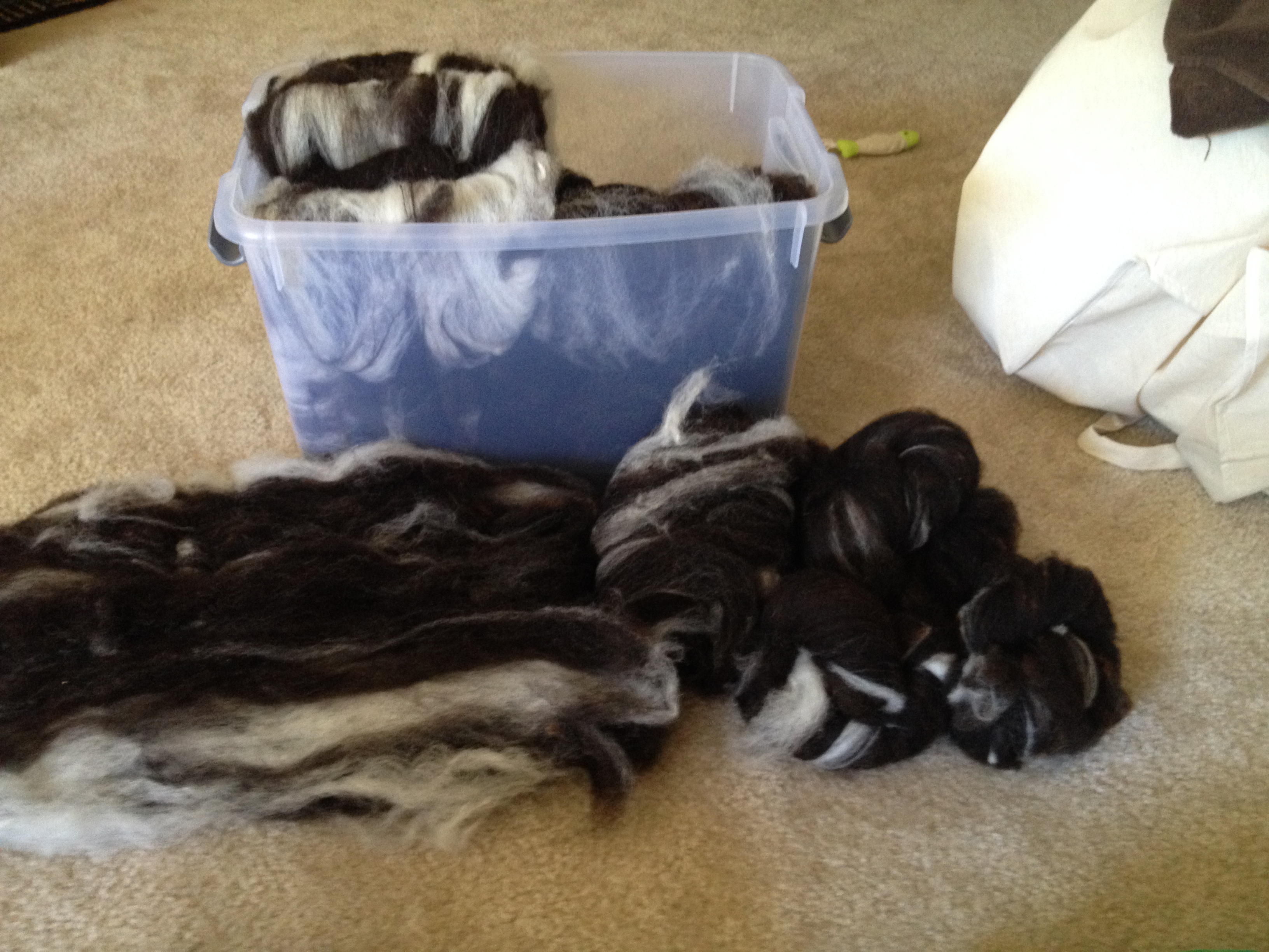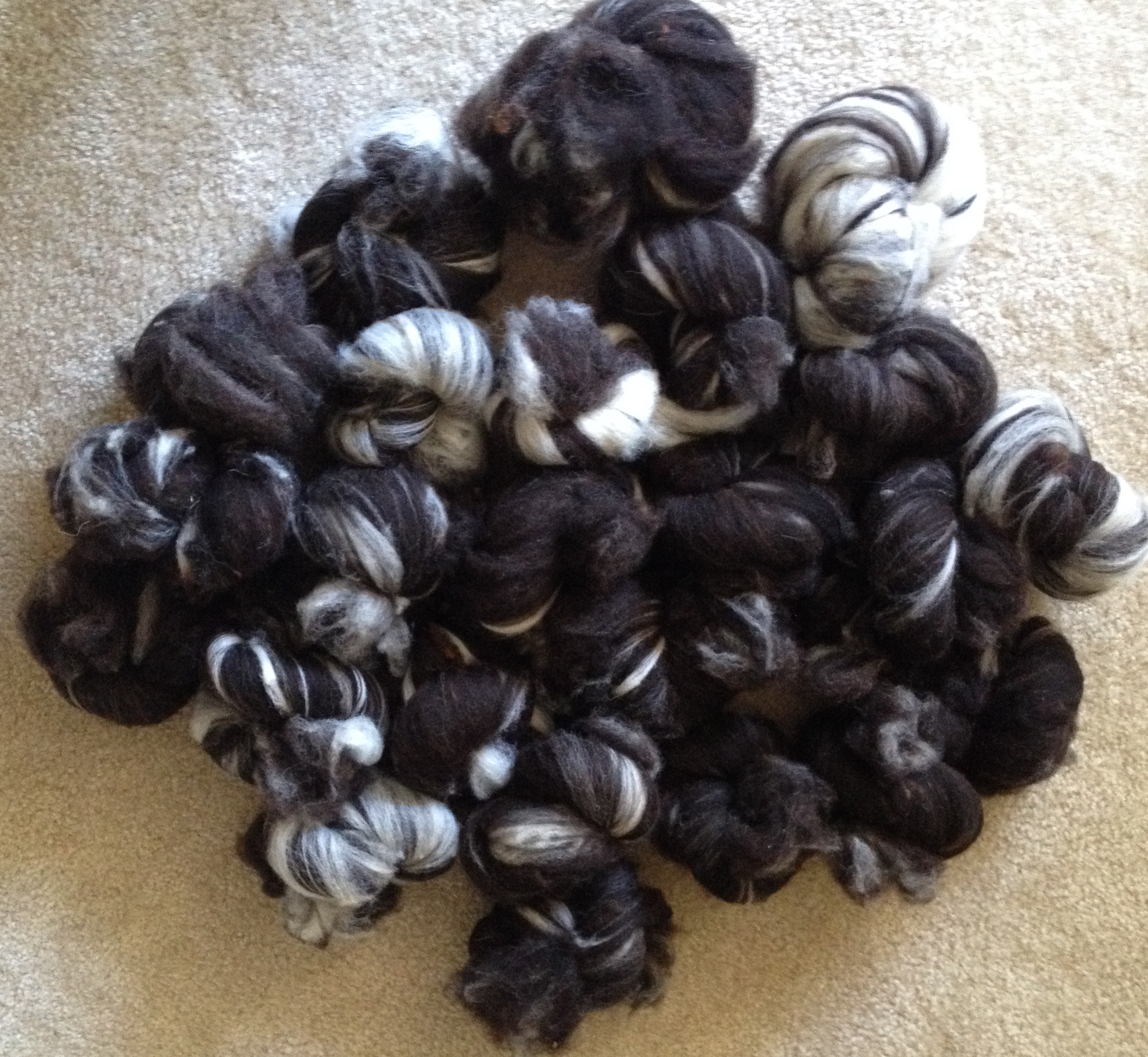 I finished processing the Jacob fleece. That’s it. The entire fleece, all rolled into little batts of happiness and joy. I no longer have to wonder if I will ever have the entire fleece combed and ready to be spun for Tour de Fleece 2018… No. It’s ready for THIS year’s spinning enjoyment. I could maybe even dream of having the sweater coat knit by the end of this year. Plus, I would much rather spin this in a true woolen-style (long-draw and carded, not combed) and three-ply it so I can have a nice aran(ish) weight yarn.