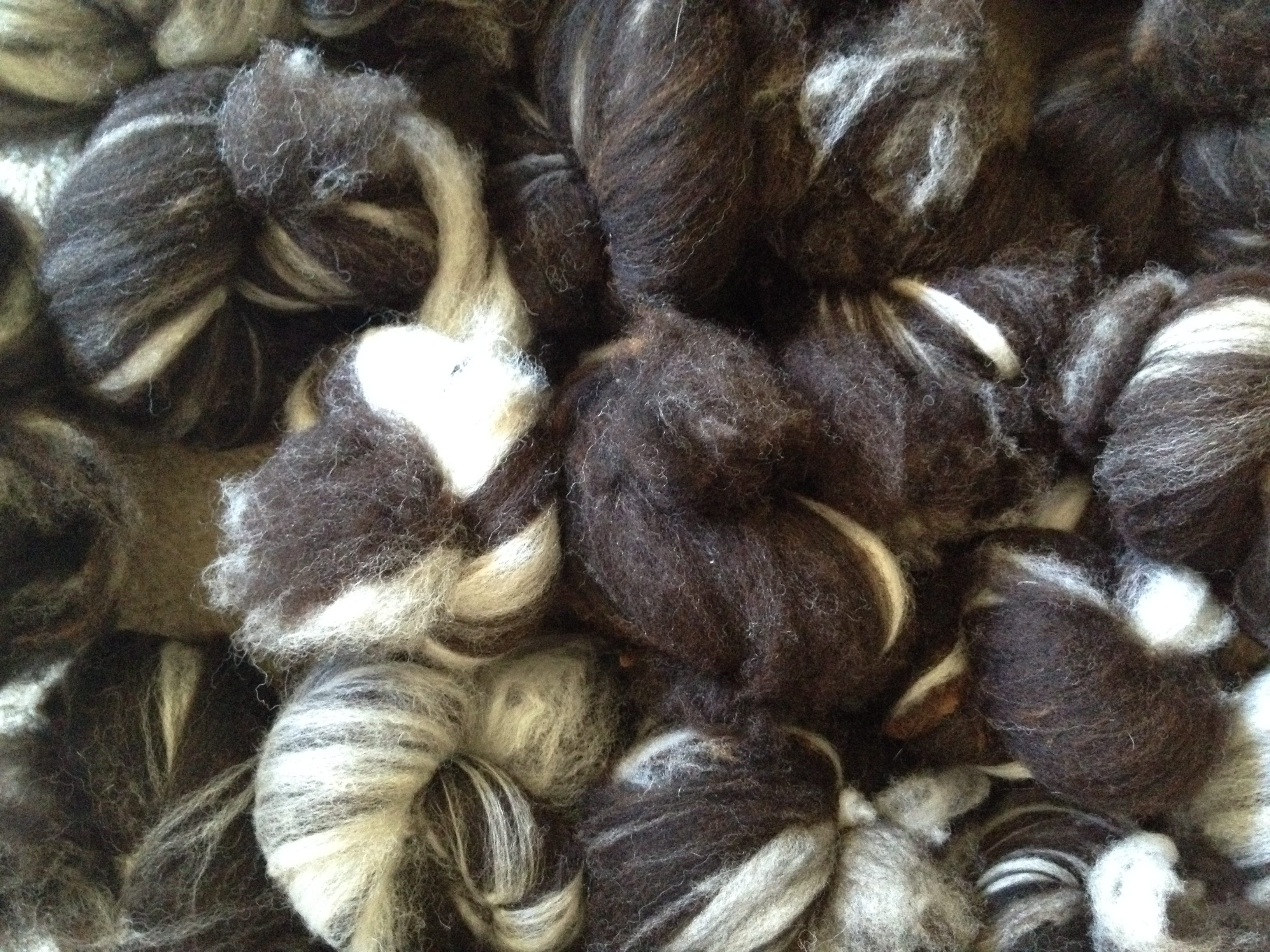 I chose to card the fleece into batts that would all have a variety of the colors of this spotted fleece. They are all mostly the dark brown with strips of gray and white. This way, it will have more of a tweedy look, instead of running the wool through the carder several times and making it a more consistent color throughout.