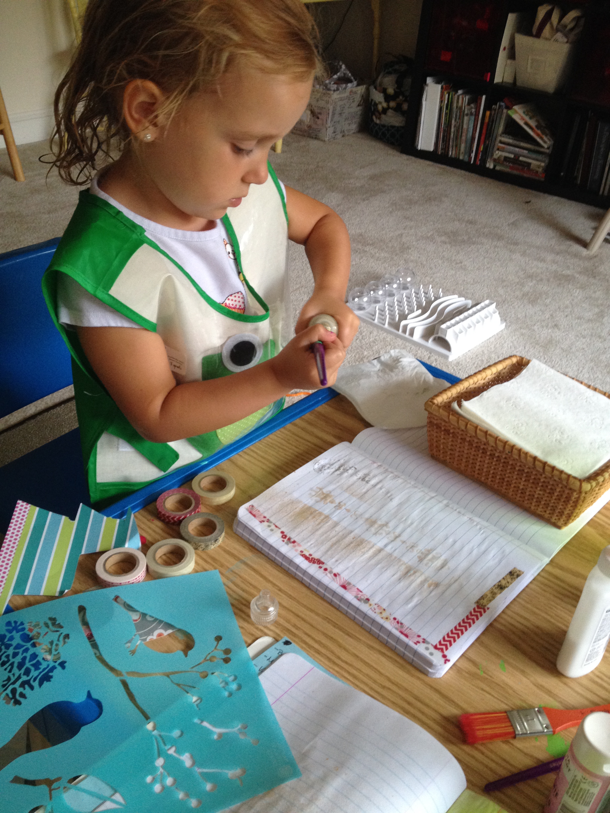 Since we’ve been home, I’ve been incredibly inspired to come up with more fun crafting/play time for my daughter and me. Last summer we had dabbled in some art journaling. This summer, M is going at it full force. We pulled out the paints, stencils, glitter glue, crafting tape and craft paper and she has been adding to her pages pretty consistently.