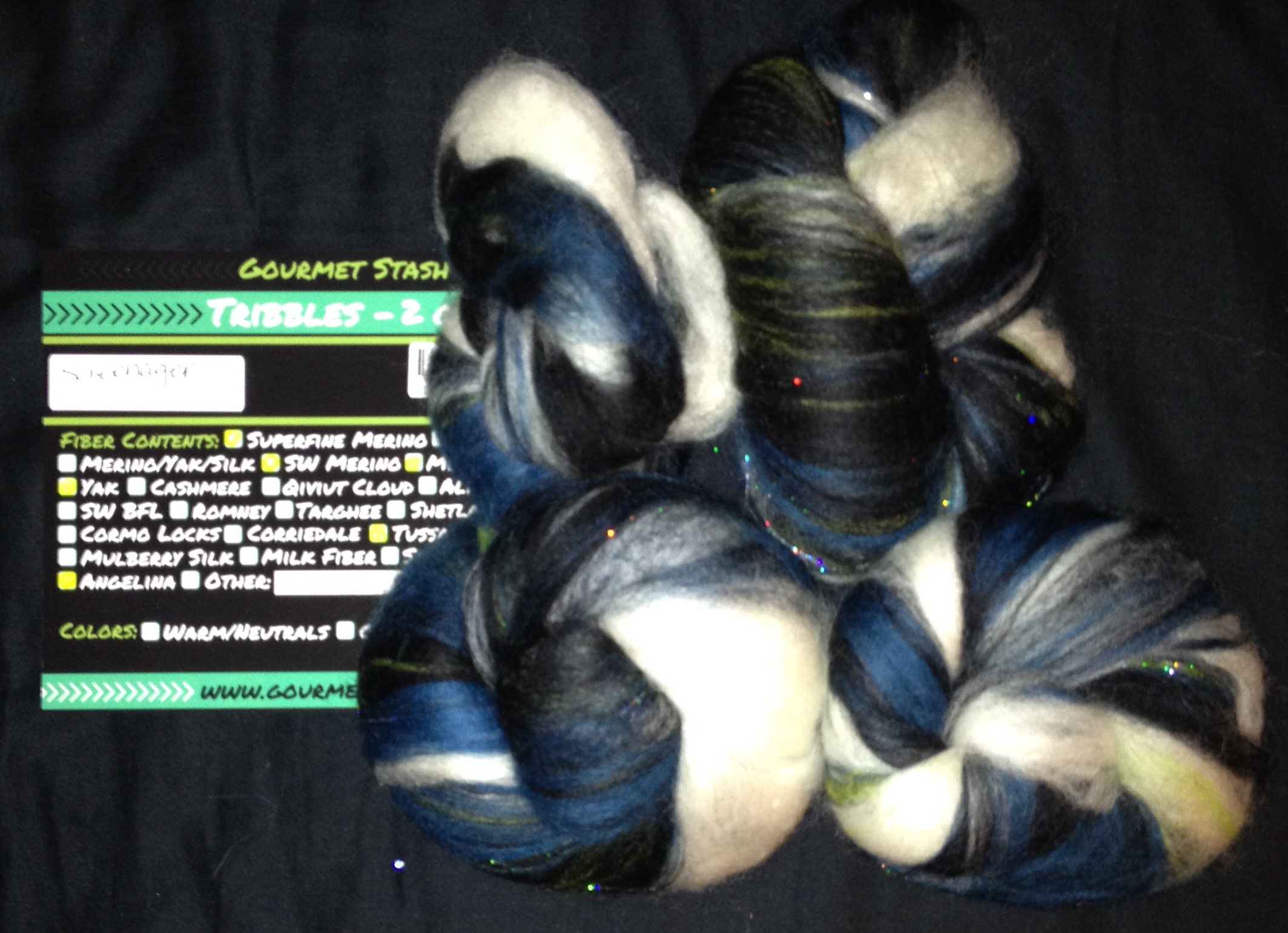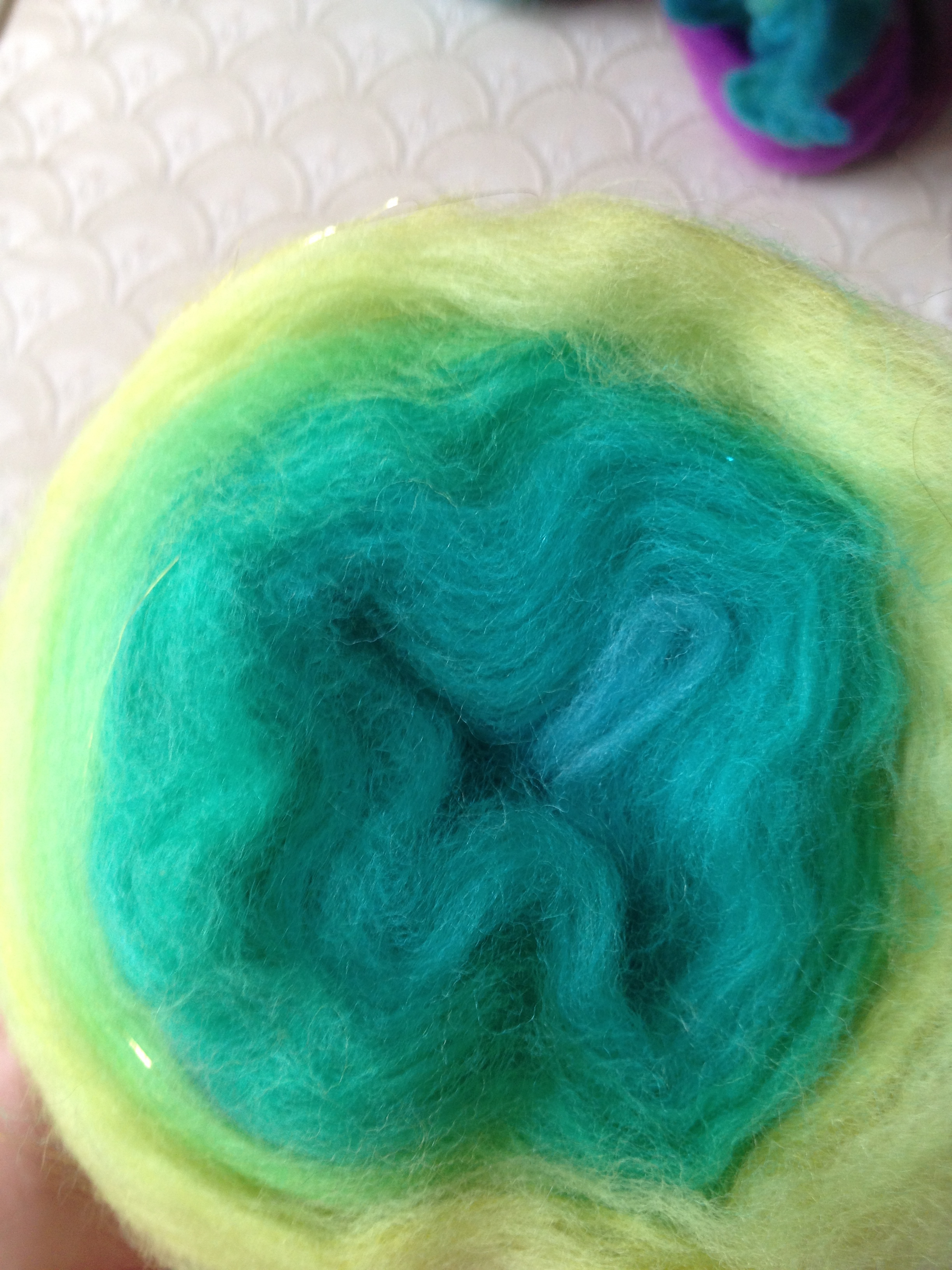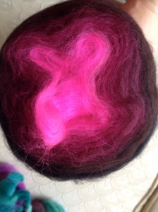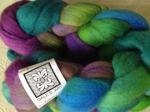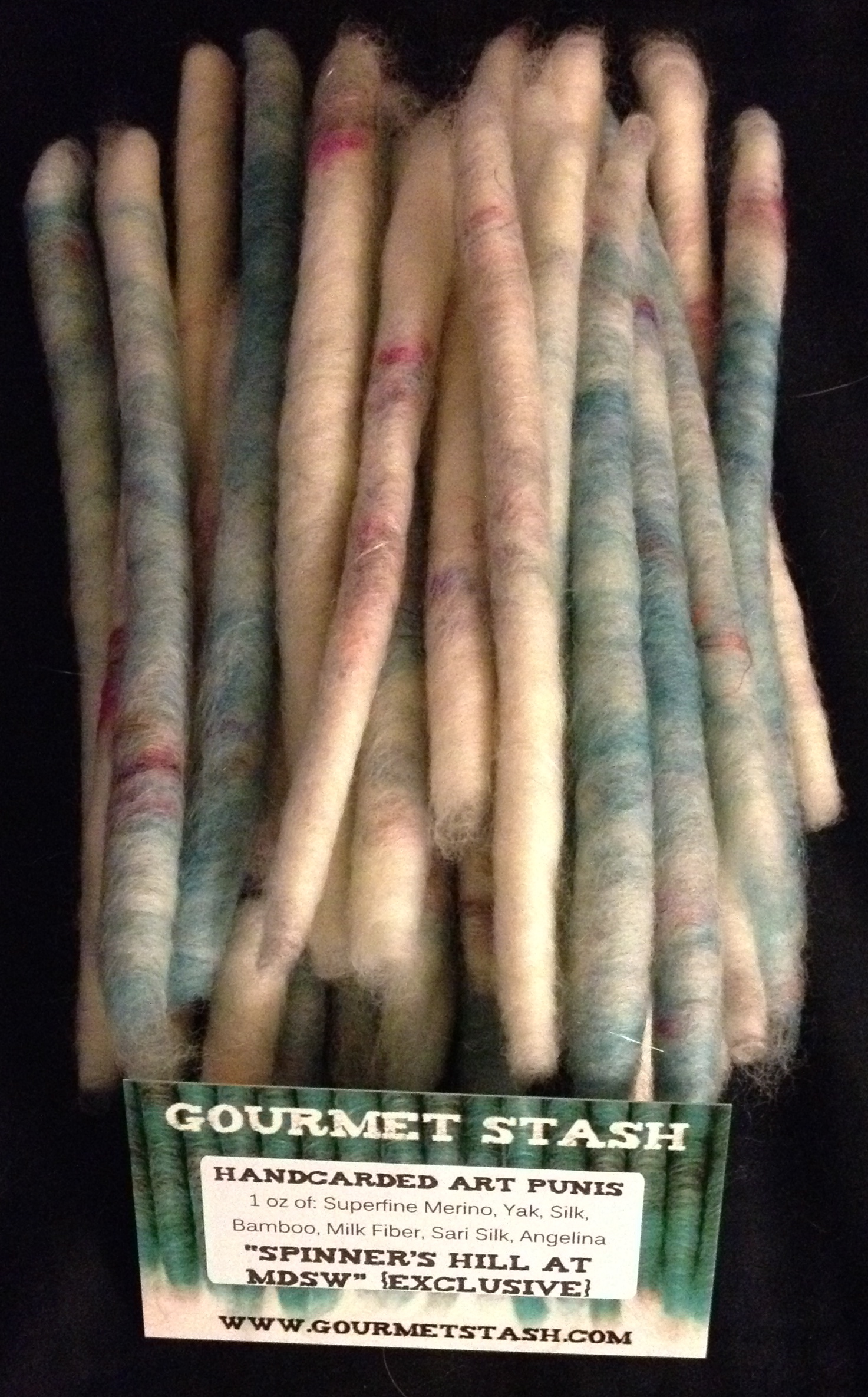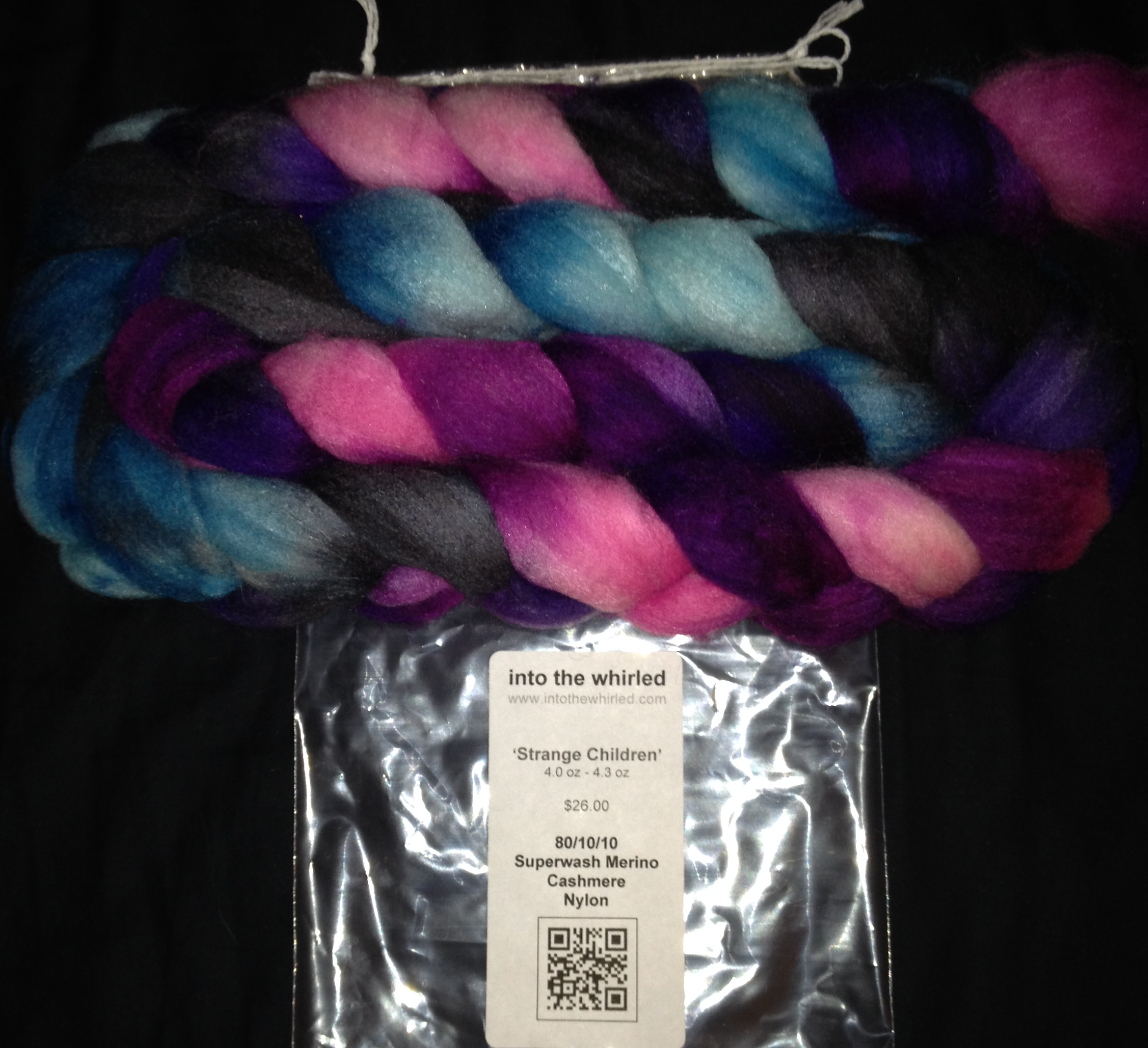 On to the goodies: I did stay strong and I only purchased fiber this year. There were a few moments were I thought about breaking down, one being at the Miss Babs booth. However, I kept it a what is a minimum for me thus far. My first fiber purchase was at the end of our first walk through at the Into the Whirled booth in the Exhibition hall. I wanted to pick up one of the last of their batts and oh so surprisingly ran into a braid of fiber that I couldn’t leave behind.