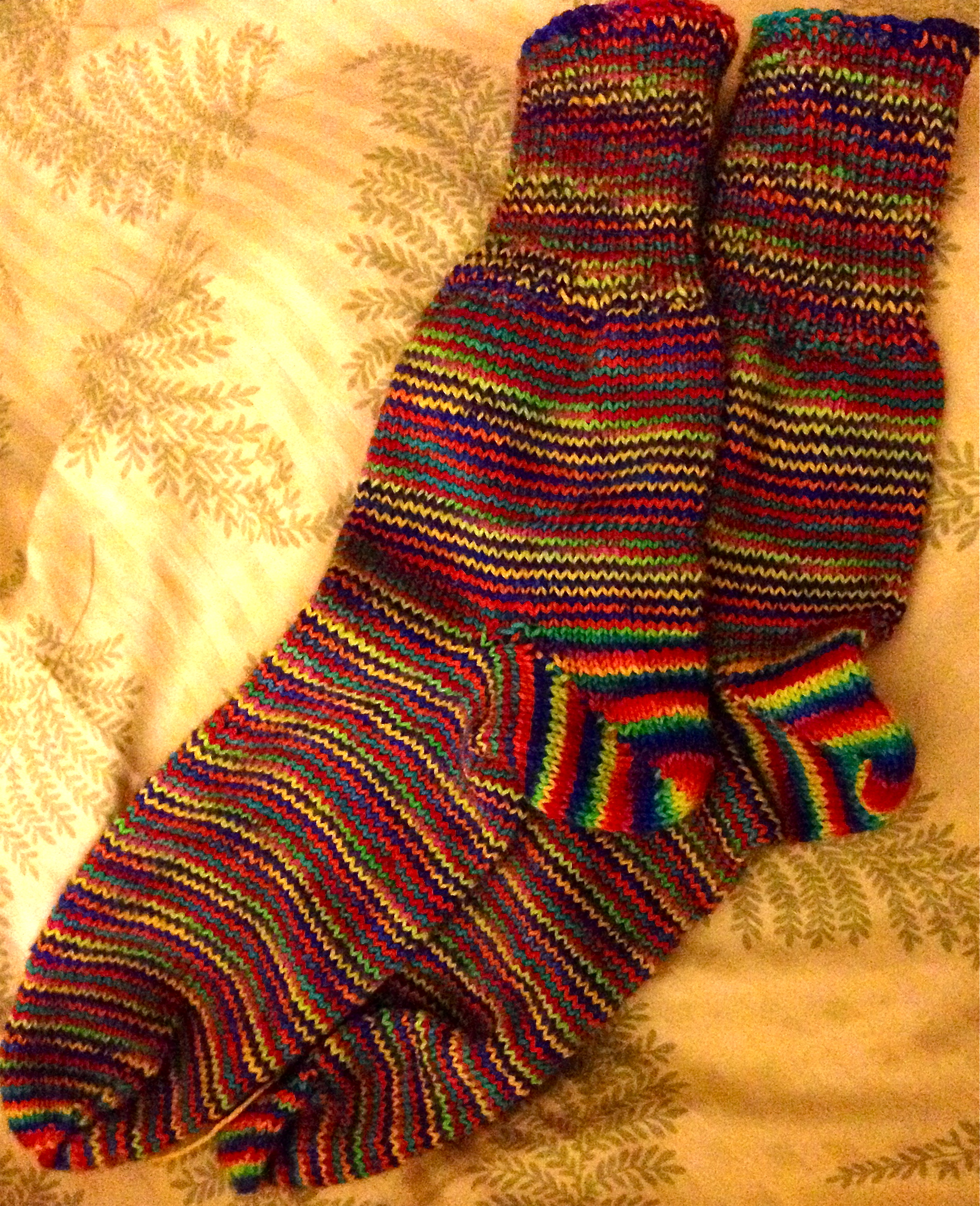 While staying at my sister’s place, I finally admitted to myself that the socks I was knitting were never going to comfortably fit my enormous feet. They were too snug and I wasn’t knitting them at a tight enough gauge to feel like my toes wouldn’t break through the stitches within the first couple wears. Luckily, my sister lives in a cold climate and is very knit-worthy… and her feet are about a size smaller than mine. The socks fit her perfectly and project 1 was completed.