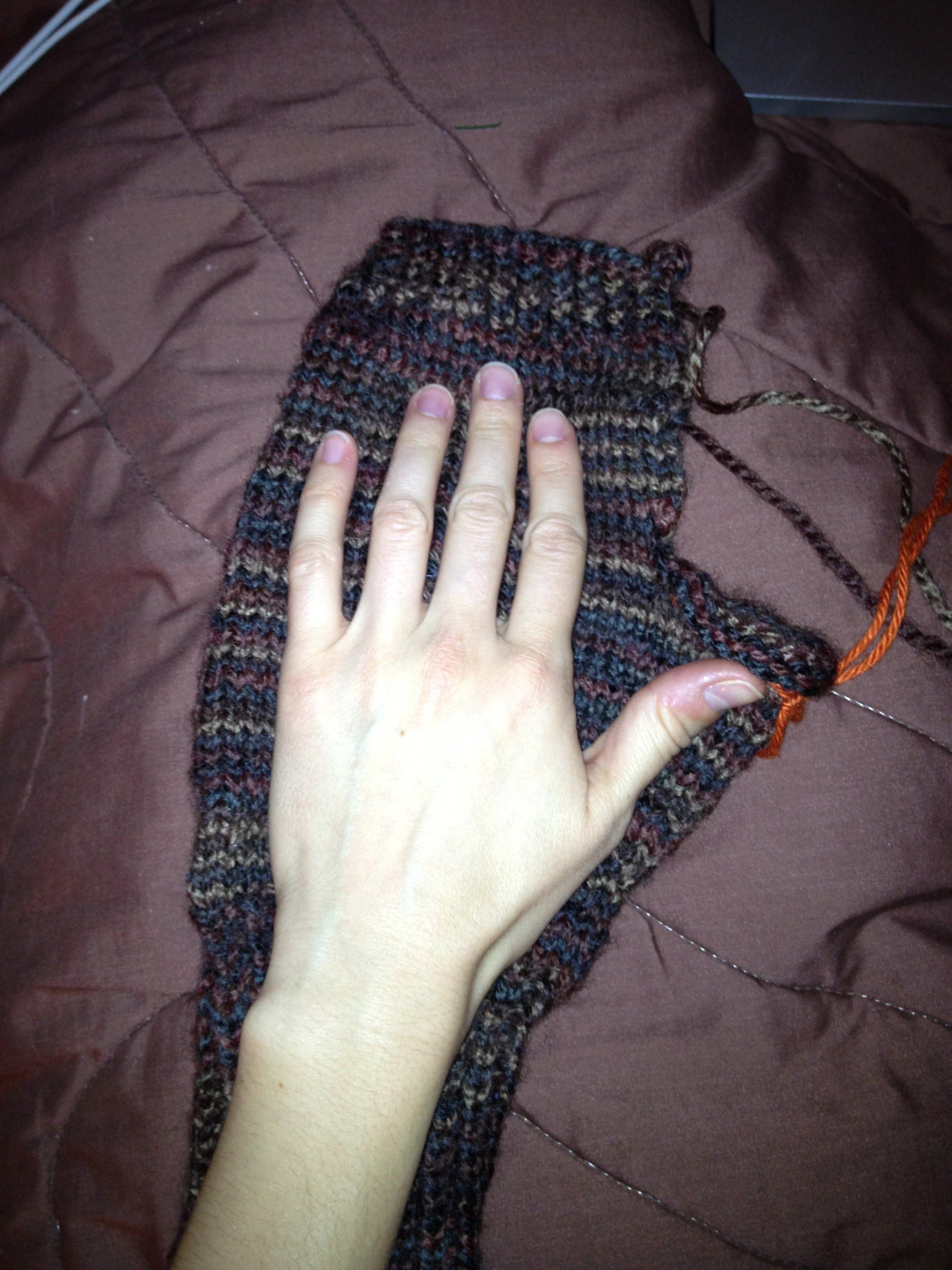 I did tell him about the failure and decided I would have him try on the almost completed first mitten so that I could eventually finish them and be certain they would fit. I remember them being a touch big, but still measuring out how large the flip-top would need to be, with every intention to finish them. Of course, they have sat for almost an entire year. Upon pulling them out to finish the first and being the second I made the realization. I am completely crazy. THIS MITTEN IS ENORMOUS! The palm alone covers my entire hand! I have freakishly long fingers…. No human beings hand would fit in this, unless the flip-top was only one quarter of an inch tall. It’s just ridiculous. Let’s not even talk about the width.