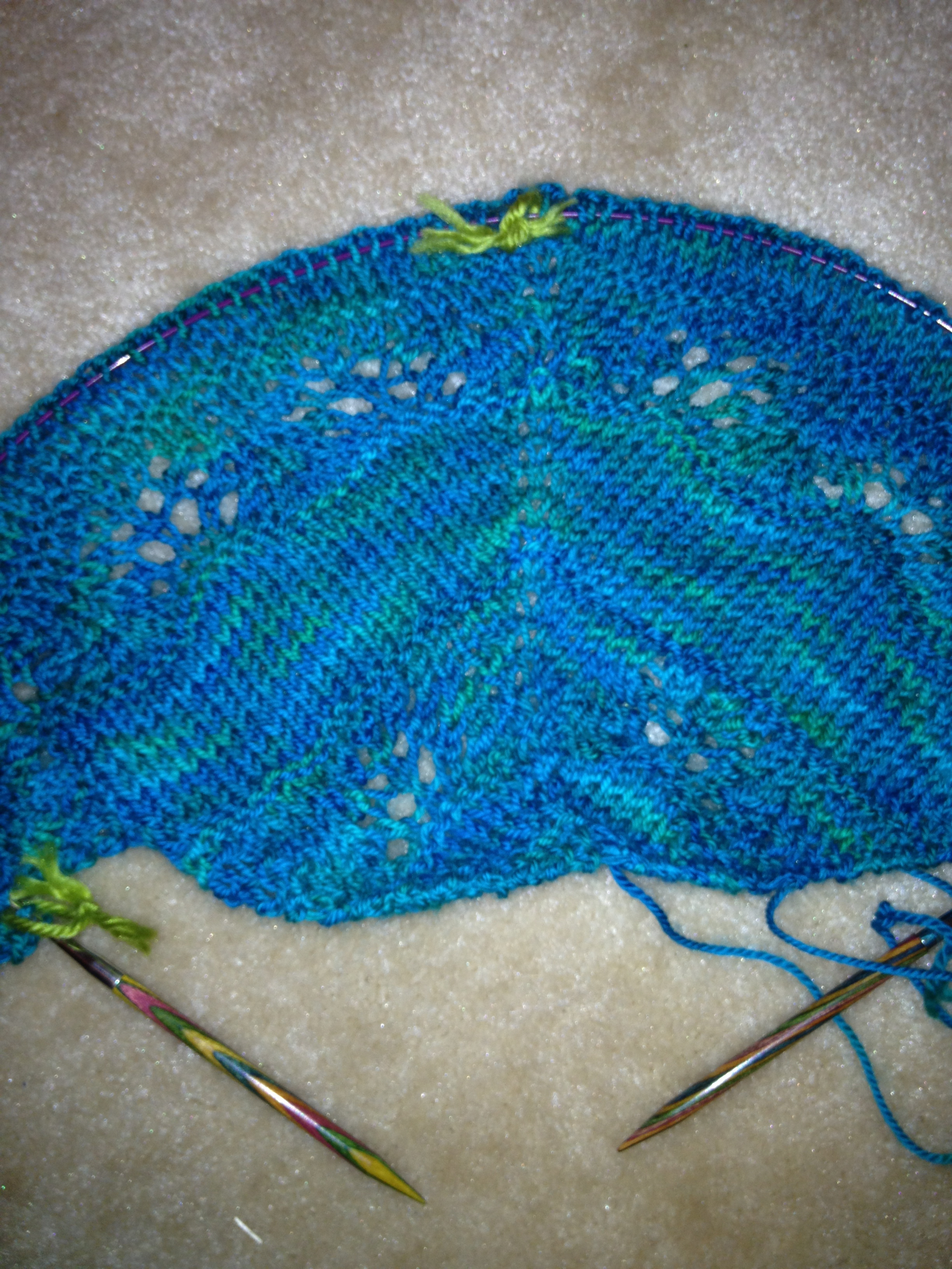 Although my numbers haven’t changed, I have been making loads of progress. One of M’s fingerless mitts is complete, and the other should be finished today or tomorrow. The shawl I am actively working on only has six more rows of the lace border before moving into the stockinette short row shaping, so this should also be finished tomorrow. Meanwhile, I have gotten a few more rows of my fathers sweater done. All-in-all, I’m not too bad off.