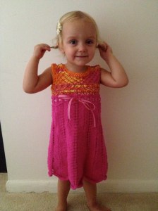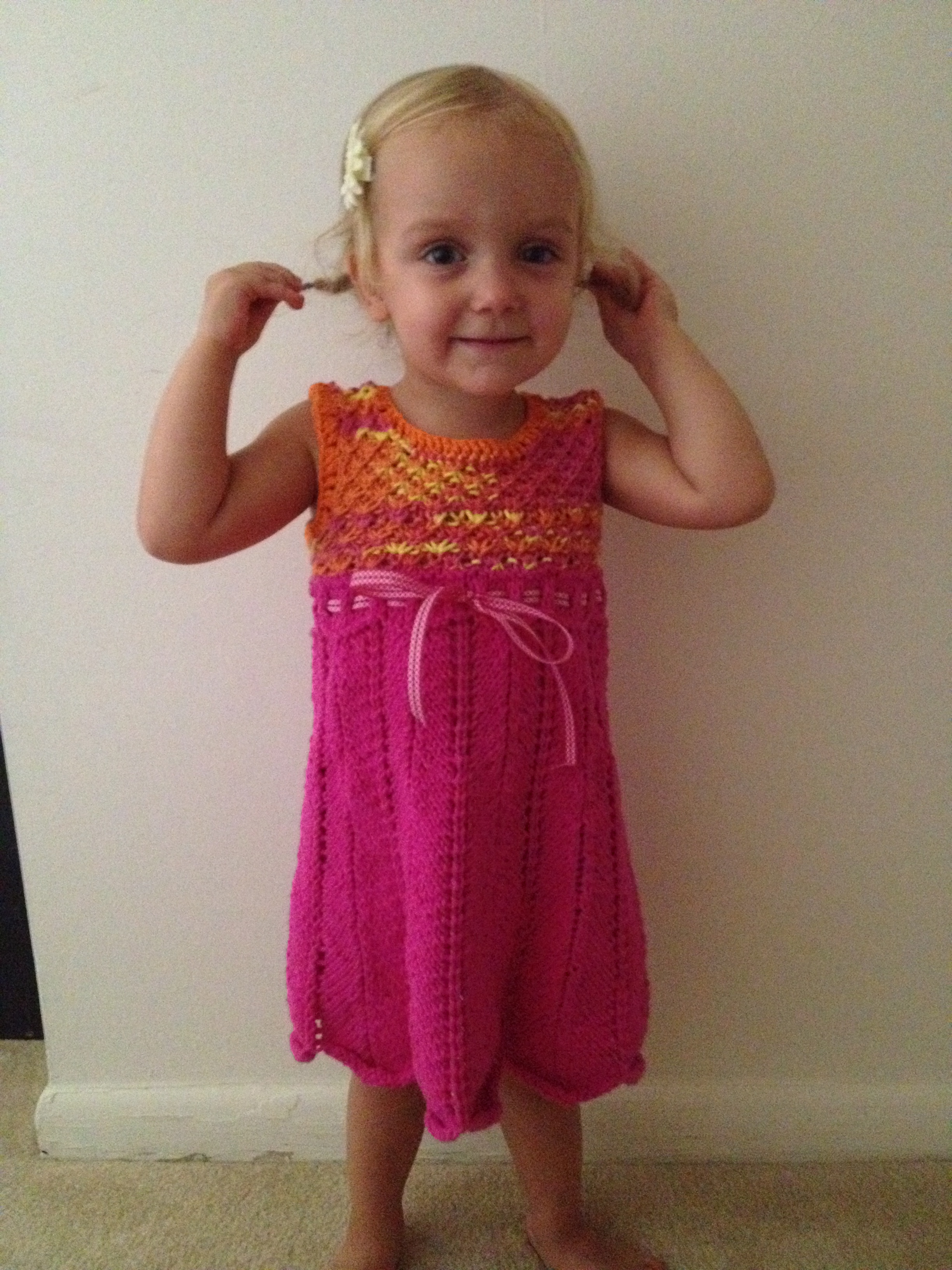 As for the cotton dress… sigh. I had been promising M, and my mother, a cotton dress for M for the summer. I had originally intended it to be finished for her to wear to Maryland Sheep and Wool in May.. but never got past the cast on. I love the end result. I even taught myself to do a double crochet edging around the armholes and neckline. I didn’t even really mind the feel of the cotton. But my hands we screaming at my every time I knit on this dress for more than ten minutes a day. Not a sitting, A DAY. I had knit cotton before.. but it was Knit Picks Shine in a Pima cotton. I know that Pima cotton is softer and just better, but I had found so many wonderful, bright and cheerful color combinations in the Sugar and Cream (dishcloth) cotton that I knew would be perfect for M. The pluses: the pattern is lovely and I felt completely comfortable knitting this poolside as I knew this dress would also get wet and have sunscreen all over it whenever M would wear it. Cotton a big plus for summer knitting… just maybe real garment cotton for big projects.